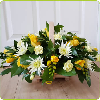 This pretty trug basket arrangement comes in shades of yellow and white.